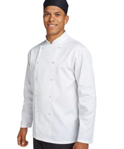 A chef’s jacket that features black plastic stud buttons that can be removed and replaced with other colours (PR652) so the culinary team can reflect restaurant branding. Designed with a Mandarin collar with top stitching and turn back split cuffs.