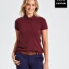 Fitted polo for women with contrast collar and placket. Two contrast coloured buttons on placket. Contrast colour on side vents. Twin needle stitching on hem. Ribbed knit collar and sleeve cuffs. Product contains no branded neck label. Removable Kimble or looped garment tags. Inner seam label holds important product information on one label with a second label containing brand information which can be cut-away. Please note old stock may contain a fixed branded label.